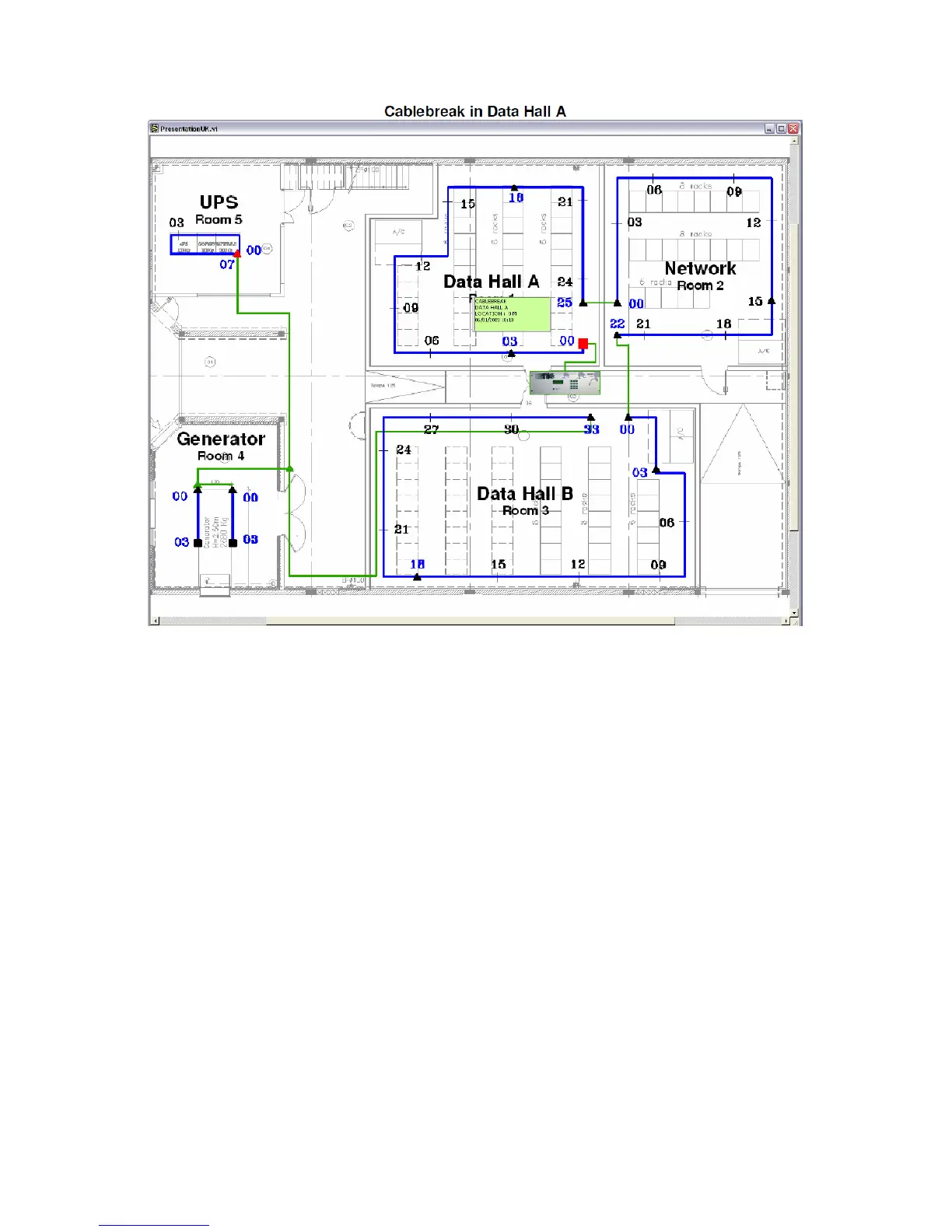 The cables in alarm status are drawn in red and the normal status cables are in blue. A small