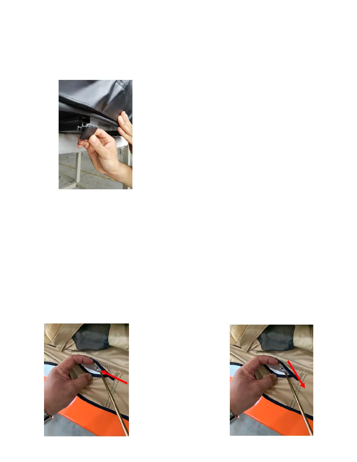 Unfasten the grommets on the awning and rainfly. Locate the fabric slits in the tent skirt. Pre-drilled
