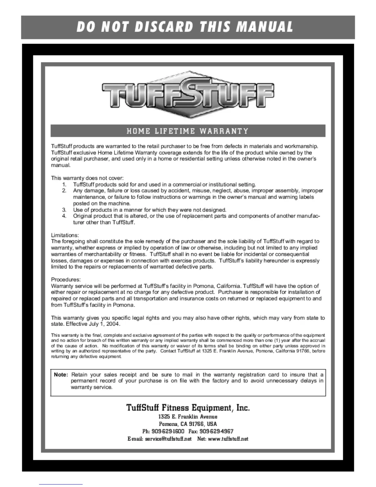 TuffStuff AXT-3D - Home Lifetime Warranty; Warranty Coverage and Exclusions; Warranty Procedures and Limitations