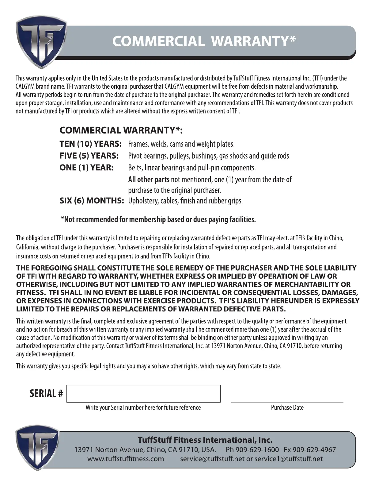 TuffStuff CG-9514 - Commercial Warranty Statement; Warranty Coverage and Limitations