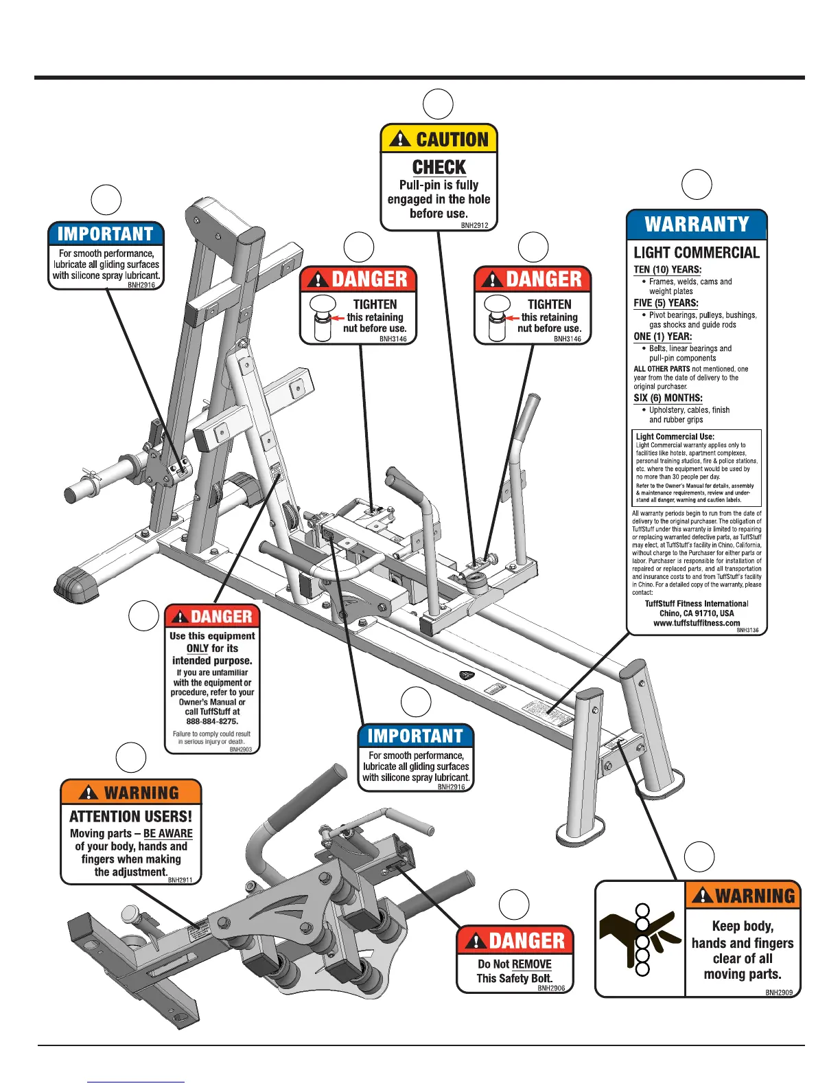 TuffStuff CLH-300 - Safety Label Identification; Key Danger, Warning, and Caution Labels; Warranty Information Summary