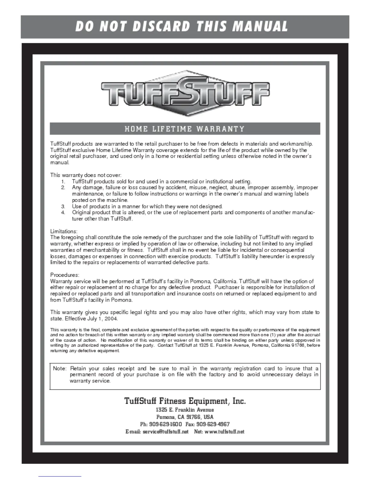 TuffStuff CXT-100 - Home Lifetime Warranty; Warranty Limitations; Warranty Service Procedures