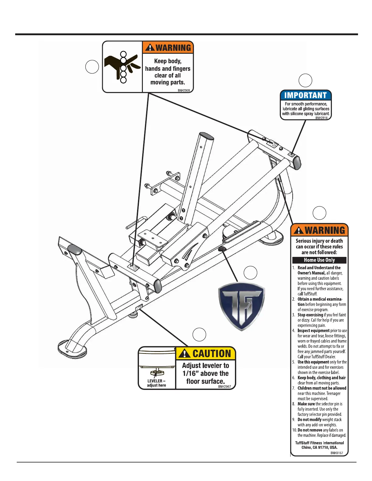TuffStuff SXT-LP - Safety Warning Labels; Moving Parts Safety Alert; General Hazard Warning; Equipment Leveler Caution