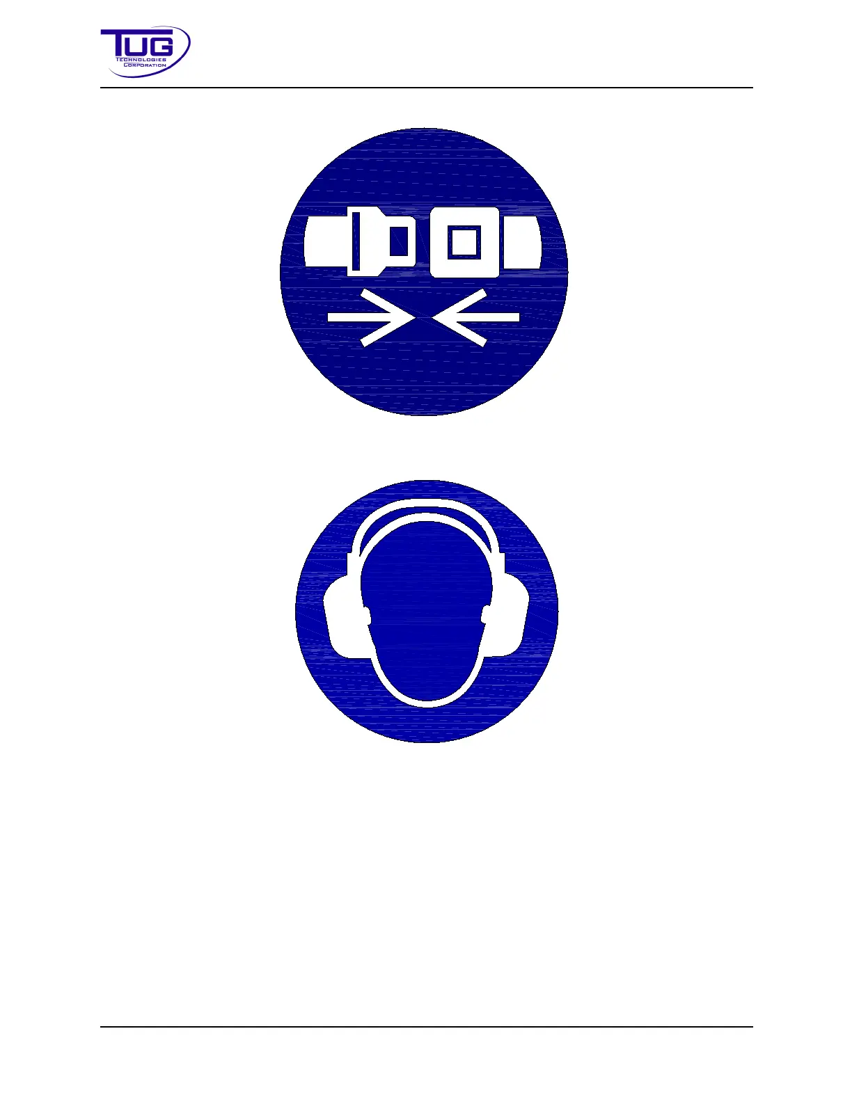 TUG Technologies 660 - Figure Safety - 2 - 4: Fasten Seat Belts (White On Blue Background); Figure Safety - 2 - 5: Use Hearing Protection (White On Blue Background)