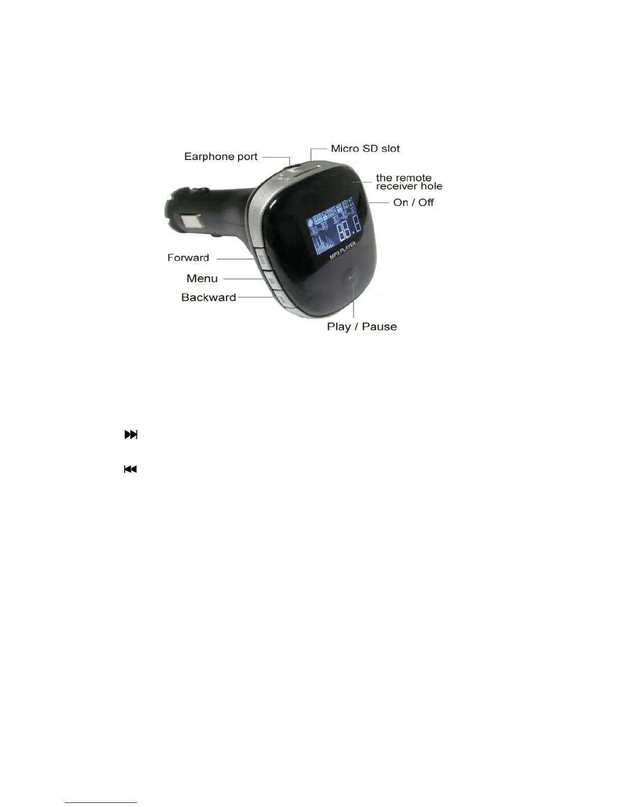 4."PLAY" key: Short press: play/pause. When in the submenu, press this button to back to