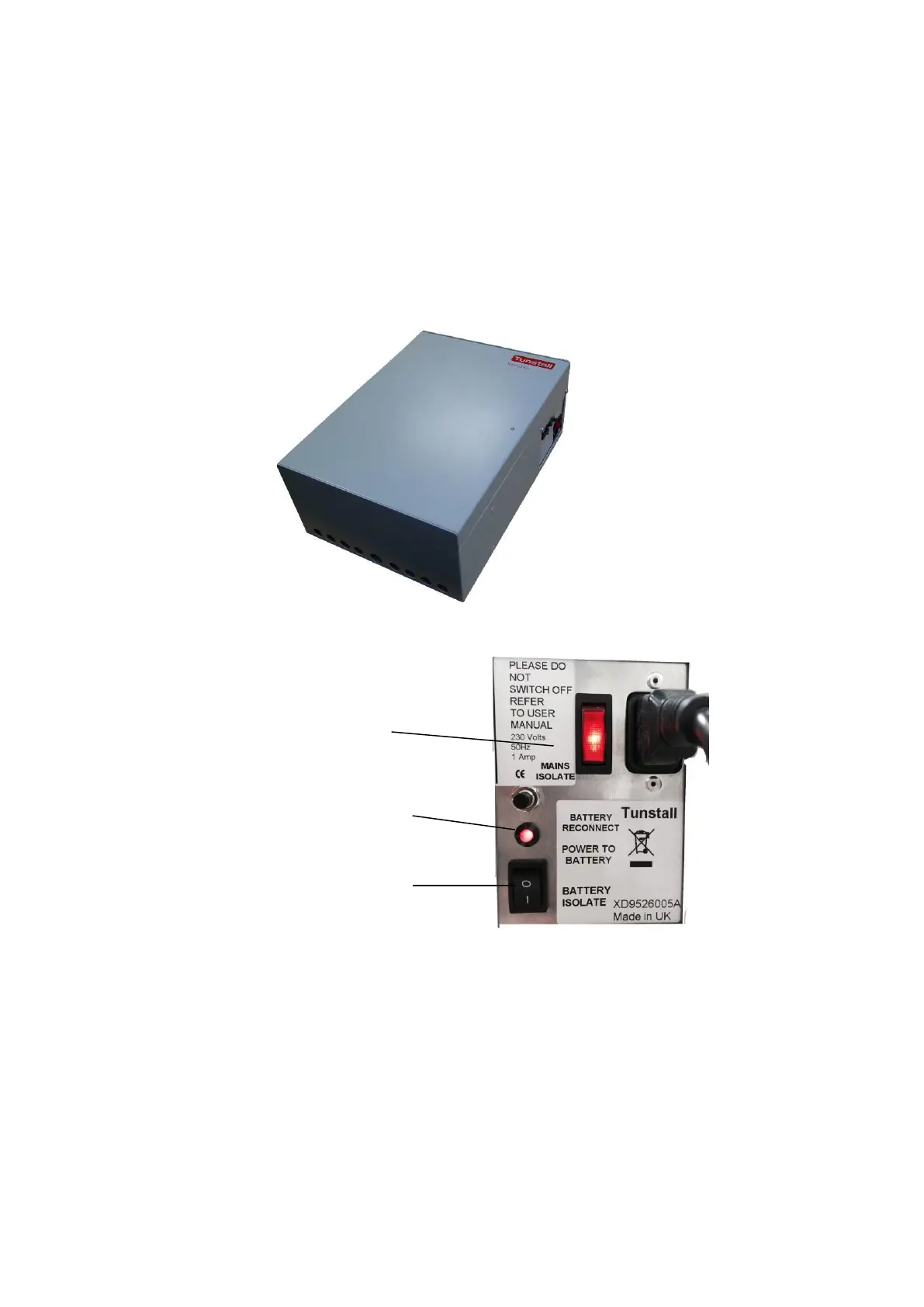 The control unit has two controls: a mains power switch and a battery in circuit switch. Under normal