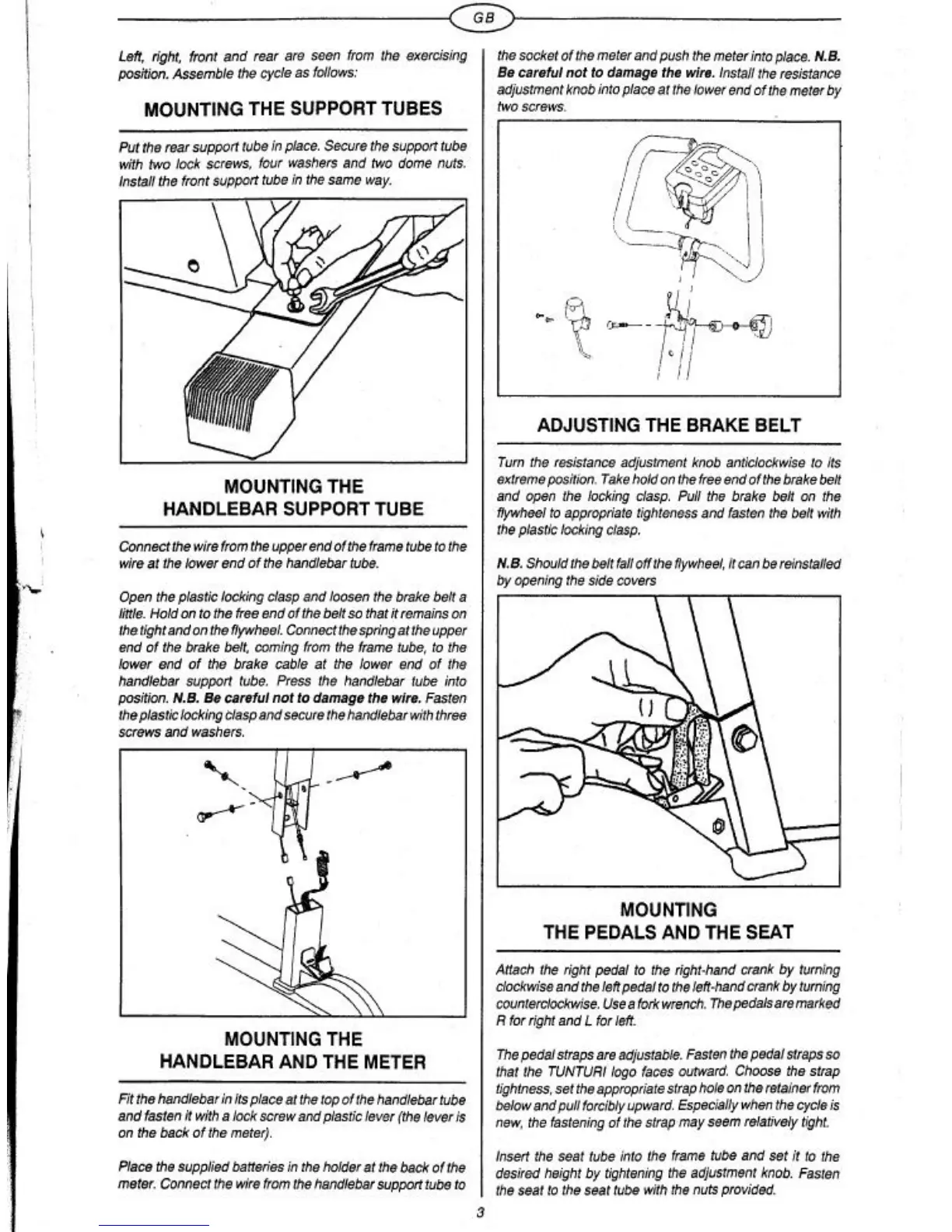 Tunturi F250 - Assembly and Adjustments; Mounting the Support Tubes; Mounting the Handlebar Support Tube; Adjusting the Brake Belt