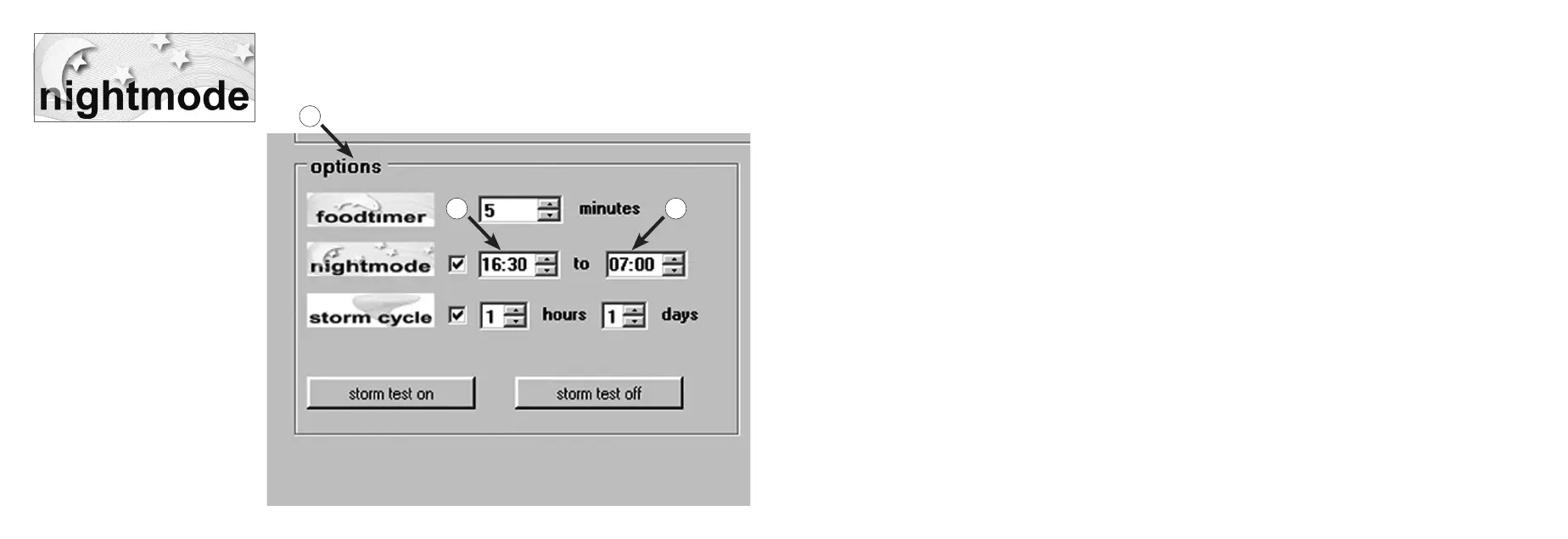 Time window for the night mode can be set by clicking on (2) and (3) hours. The internal real time clock will interrupt