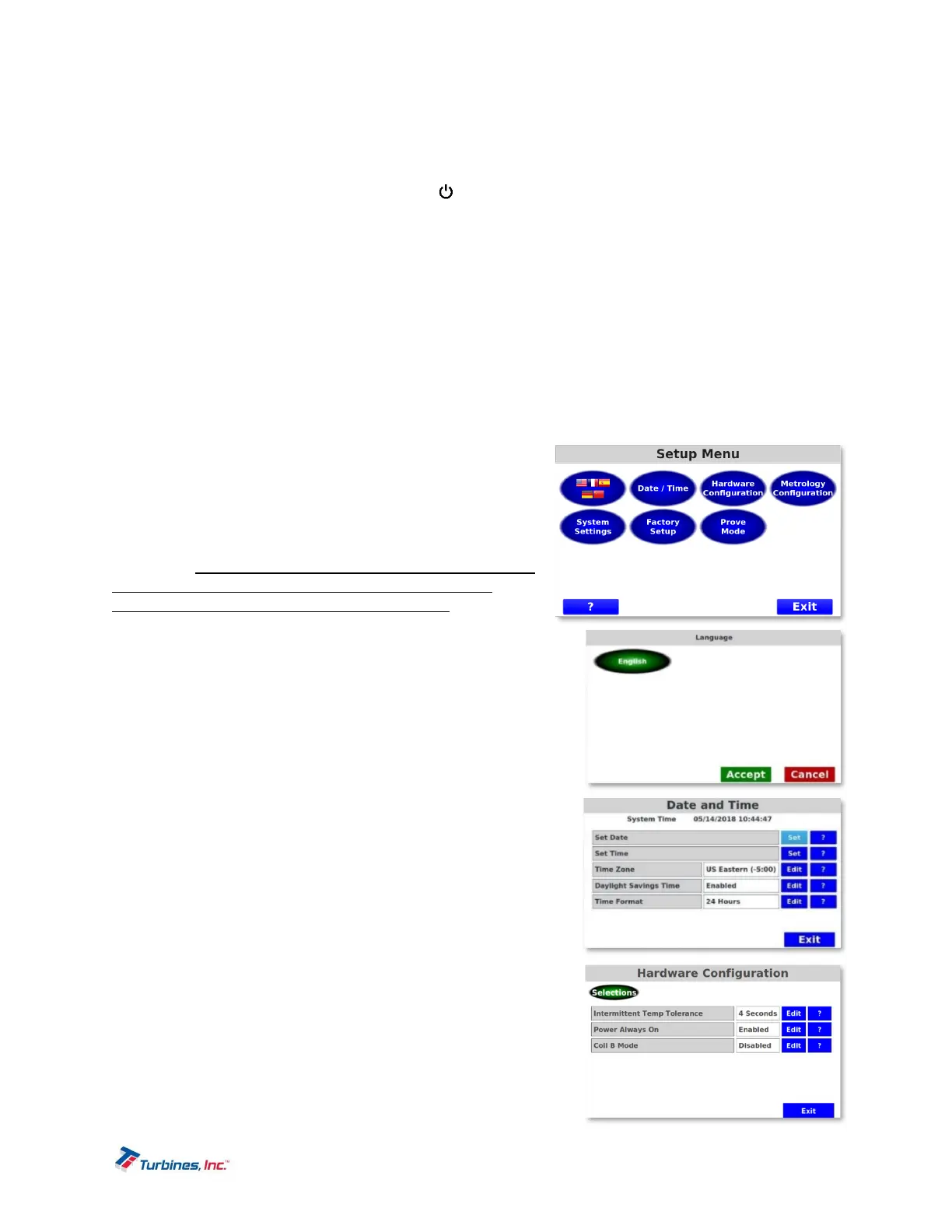 turn the power on by holding down the Power button. The Turbines, Inc. logo will be displayed for