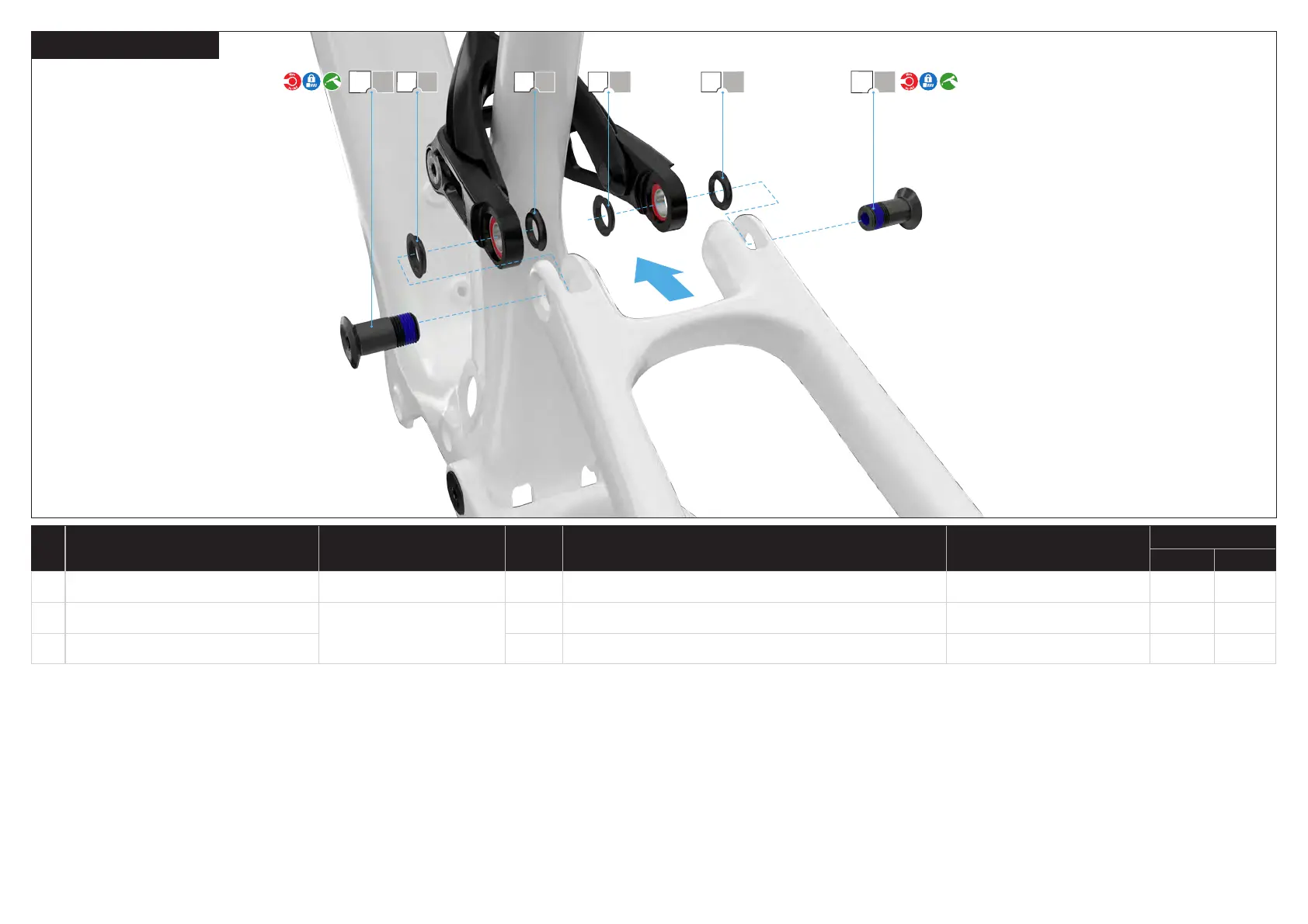 Grease and place the link at seatstay spacers (M) (x4) with the reduced edge against the bearings of the upper