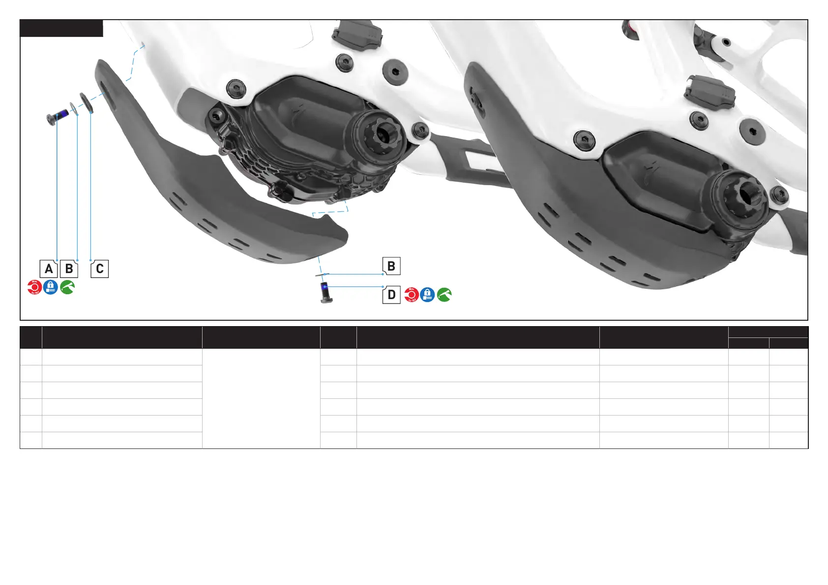 Insert the rear rock guard bolt and washer. Use a torque wrench and 4 mm hex bit and torque to specification.