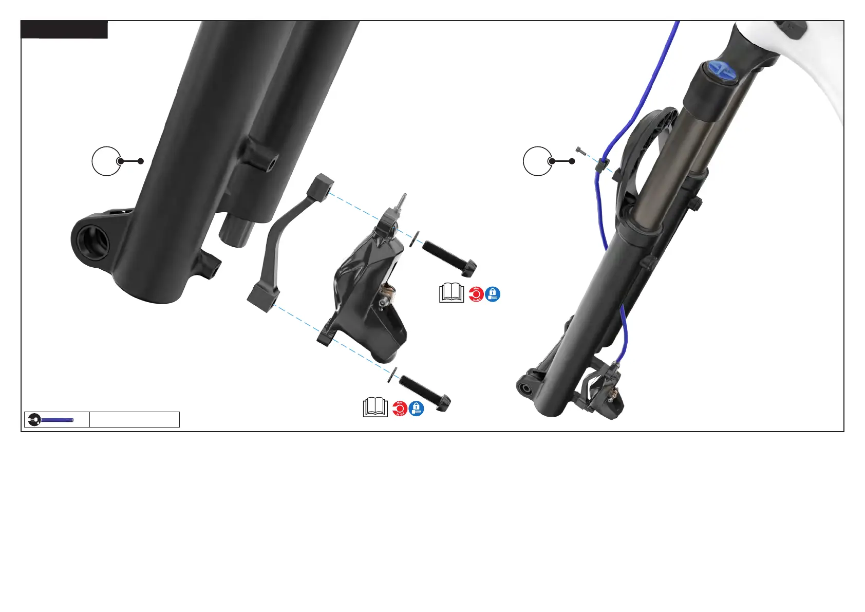 1. Install the front brake caliper and brake caliper adaptor to the fork following the manufacturers instructions. Use