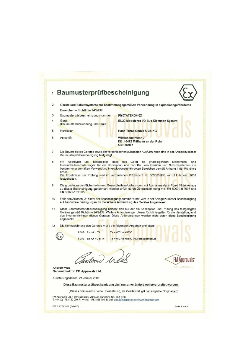 turck BL20 - Zertifikate für Europa; Baumusterprüfbescheinigung