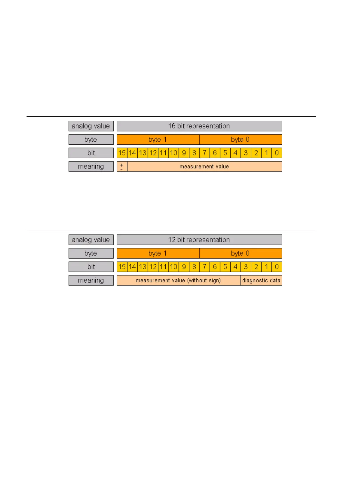 The analog values can either be represented with 16 bit or 12 bit. The two's-complement representa-