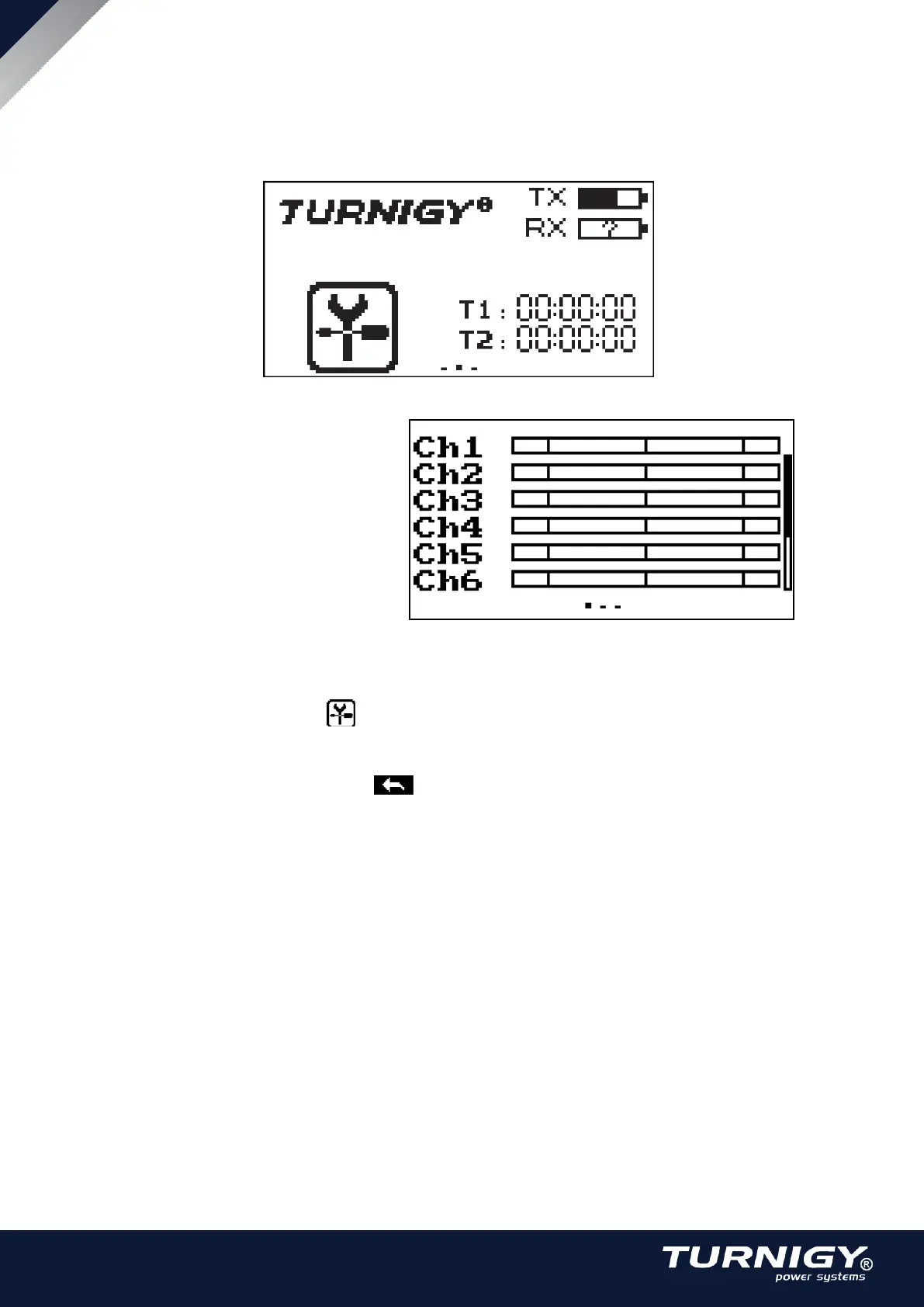 The home screen diplays useful information about your model, including timers and TX/RX status. L'écran d'accueil affiche