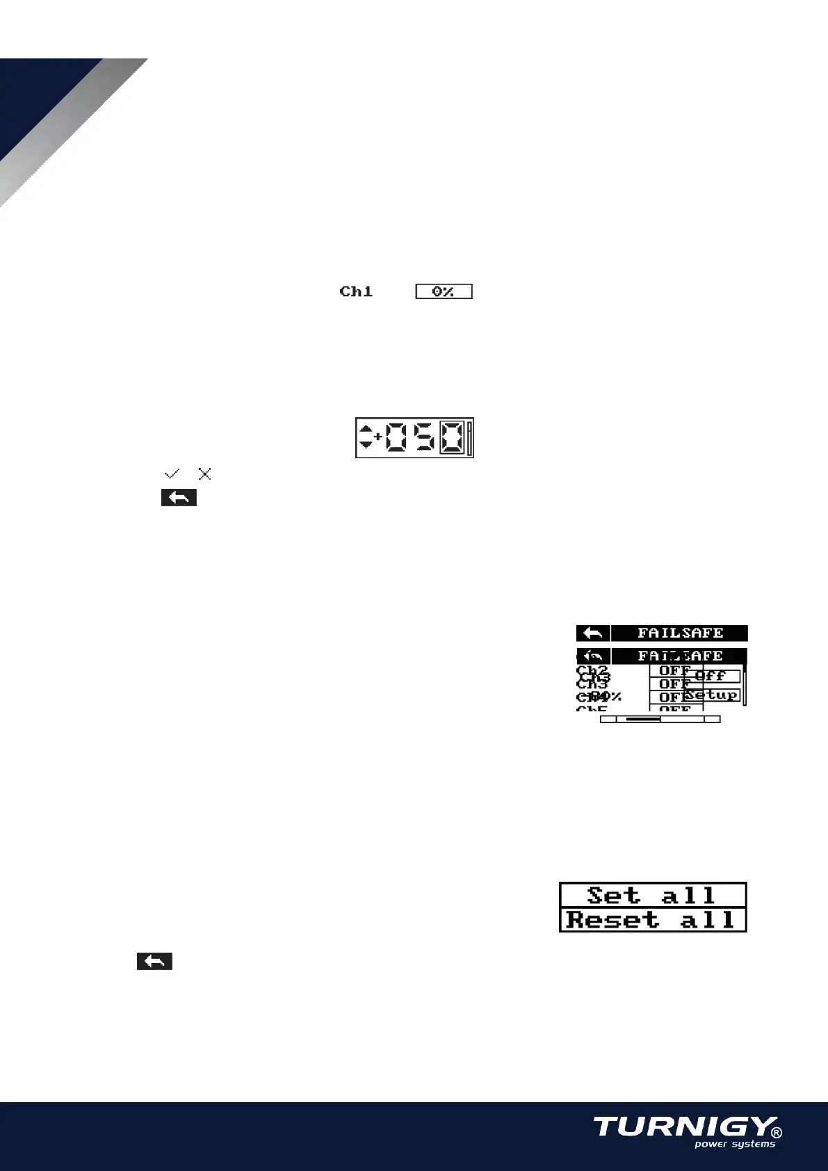 The failsafe function enables you to pre-set channel positions for the receiver in case of signal loss. Setup: