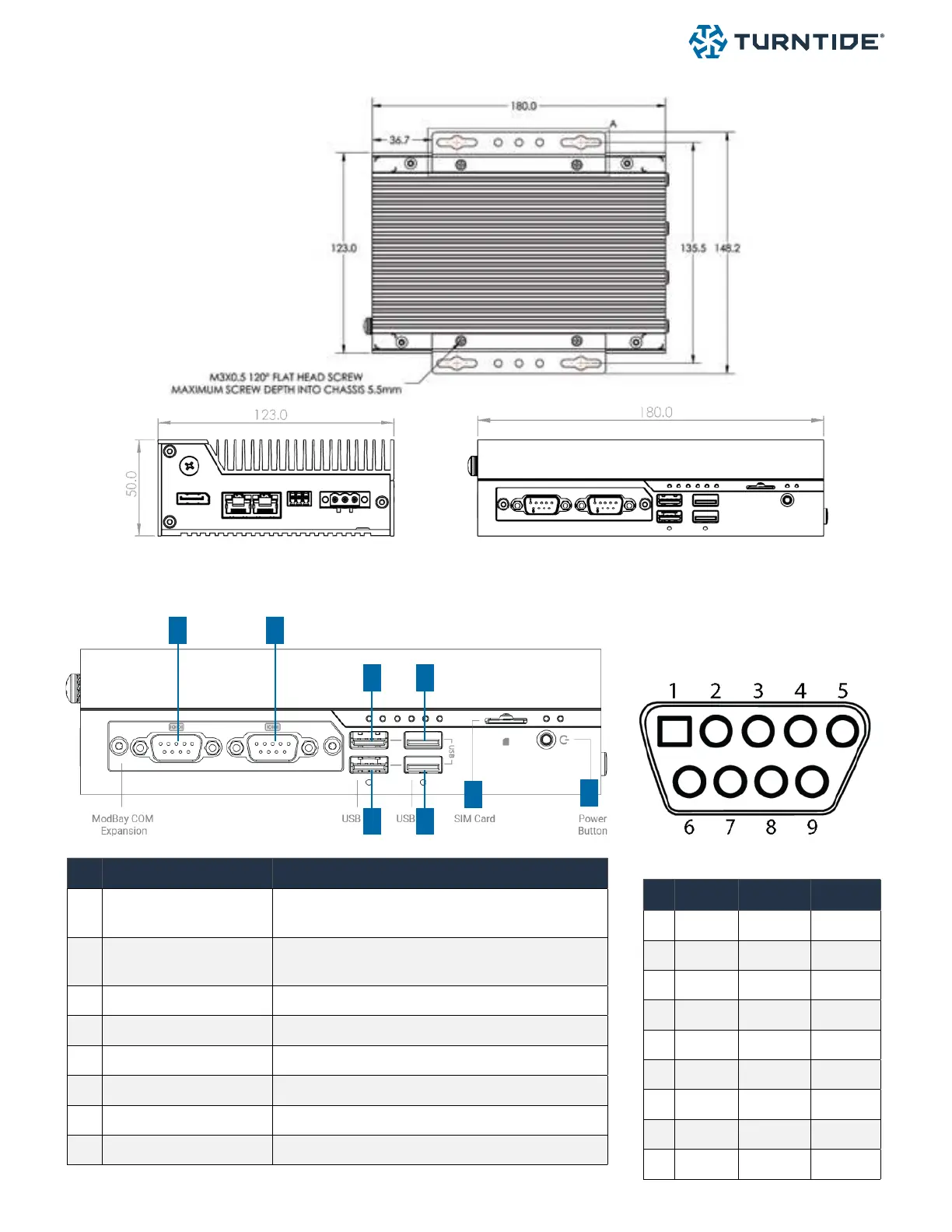 TURNTIDE Hub 7 - Product Overview; Dimensions; Left View