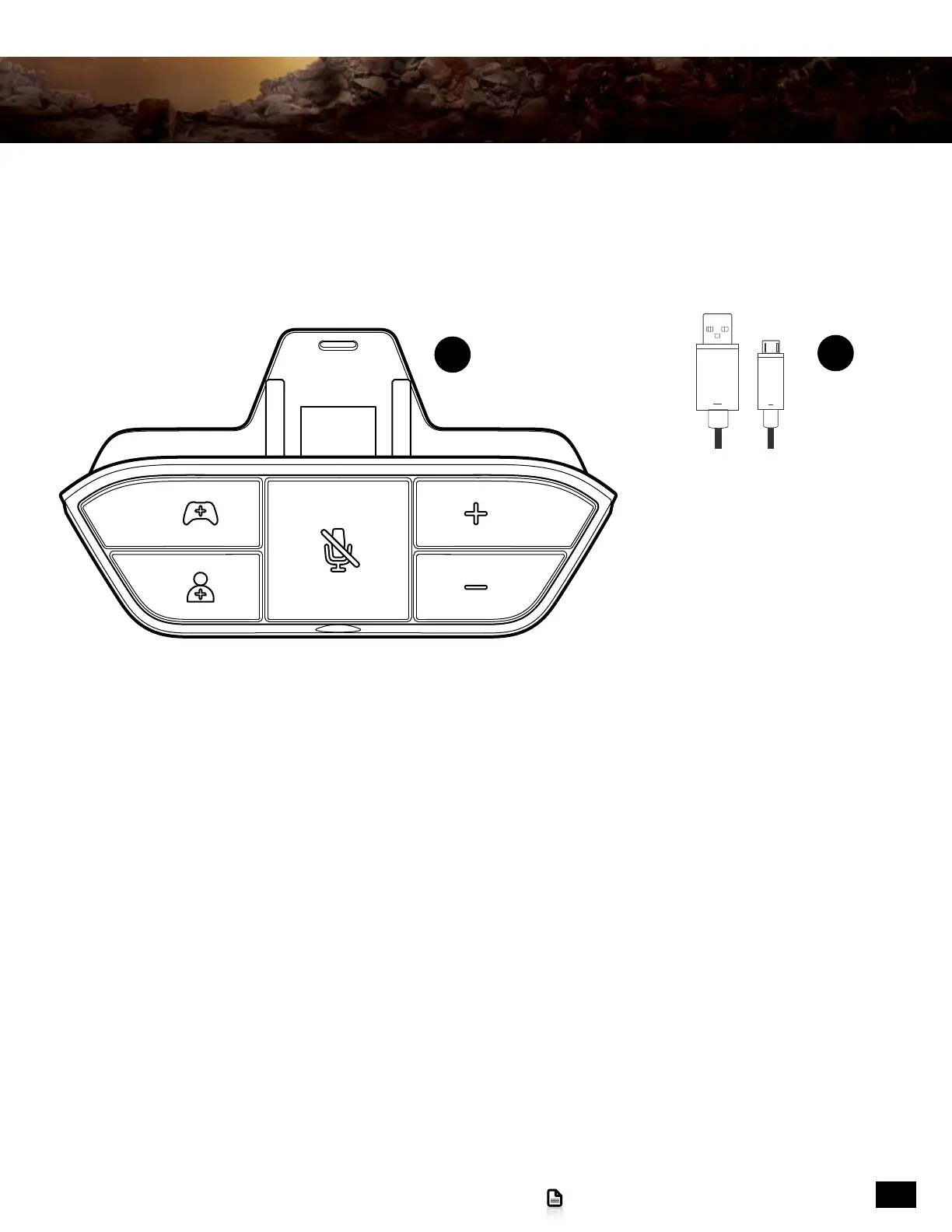 the Xbox One controller (not supplied with the headset). The adapter places game volume, chat volume and mic mute