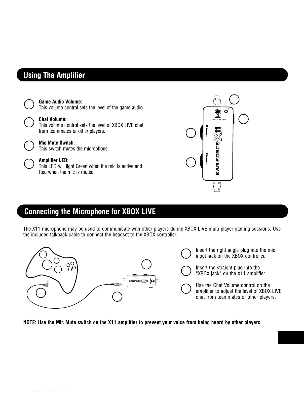 Turtle Beach Ear Force DX11 - Using the Amplifier; Amplifier Controls; Connecting Microphone for XBOX LIVE