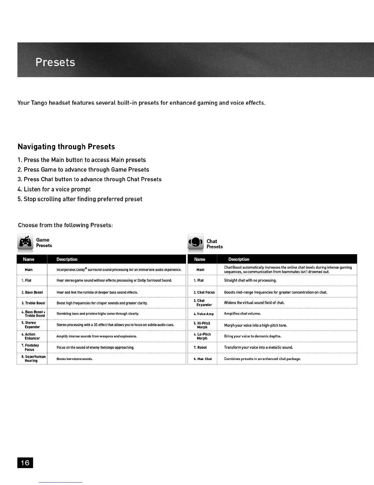Turtle Beach Ear Force Tango - Audio Presets; Navigating and Selecting Presets; Game and Chat Presets List