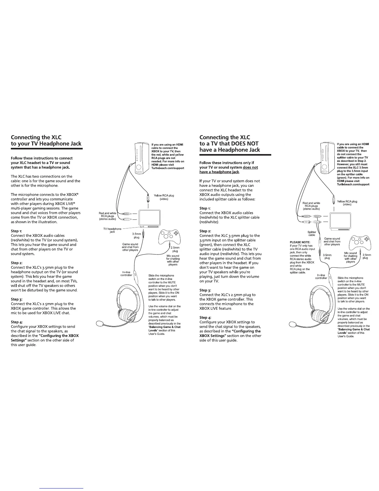Turtle Beach Ear Force XLC - Connecting the XLC to TV Audio Outputs; Connection to TV with Headphone Jack; Connection to TV Without Headphone Jack; Configure XBOX Chat Signal