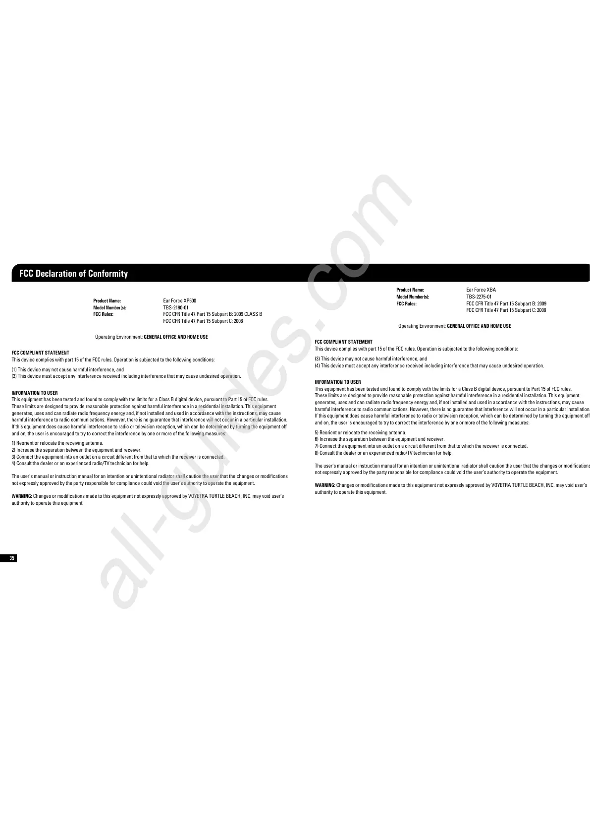 WARNING: Changes or modications made to this equipment not expressly approved by VOYETRA TURTLE BEACH, INC. may void user’s