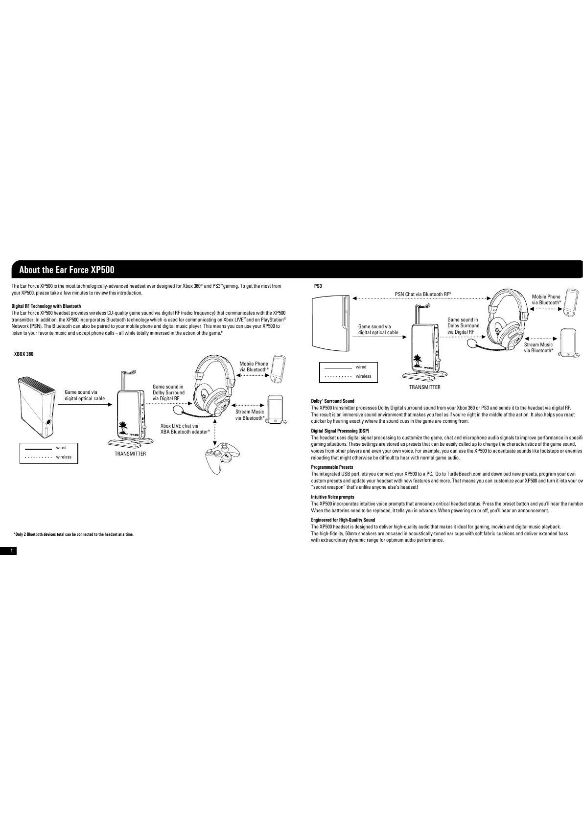 The Ear Force XP500 headset provides wireless CD-quality game sound via digital RF radio frequency) that communicates with the XP500
