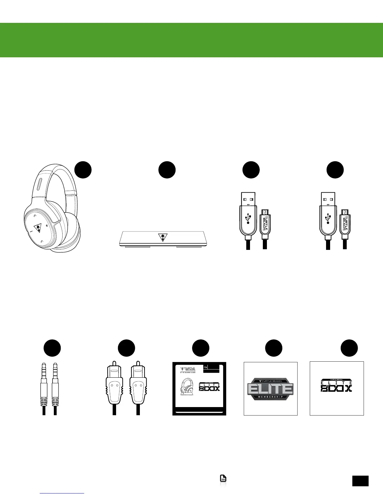 Turtle Beach Elite 800X - Package Contents; Turtle Beach Elite 800 X Headset; Elite 800 X Transmitter & Magnetic Charging Stand; USB Transmitter Cable