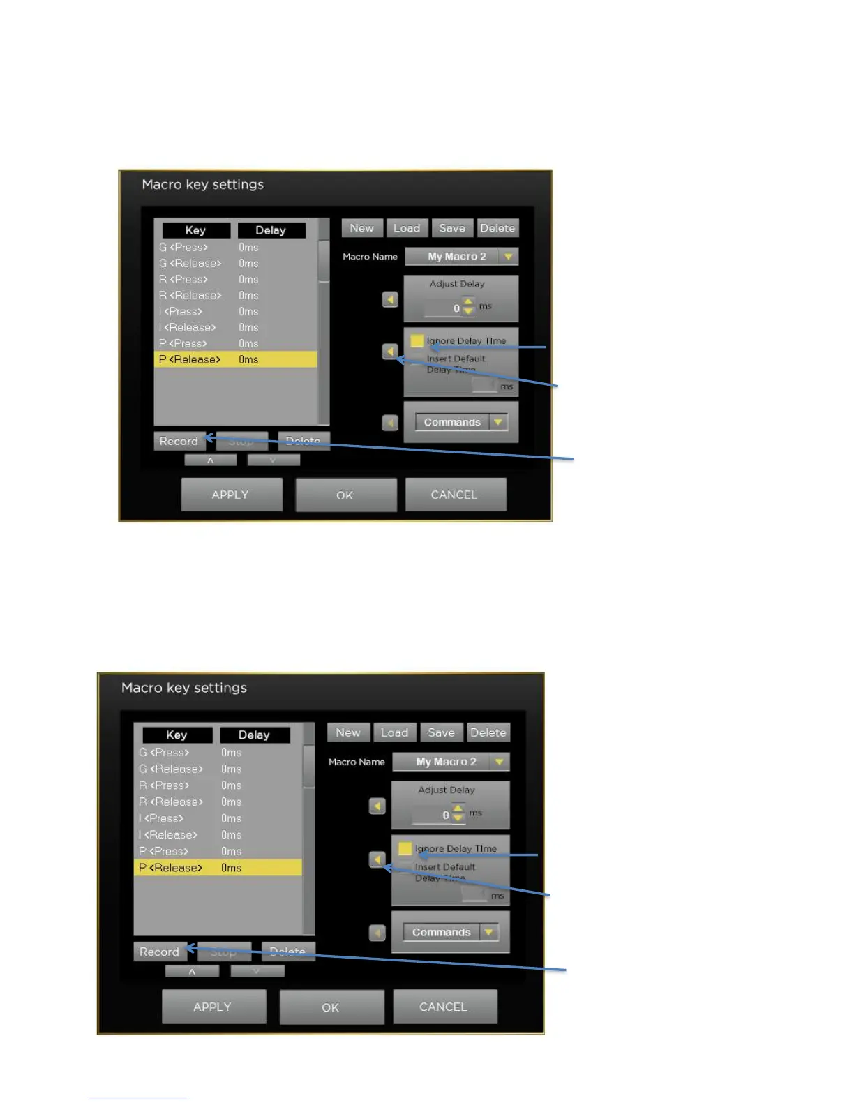 box next to the Ignore Delay Time Box then click the apply Arrow. Then press Record and press all the keystrokes