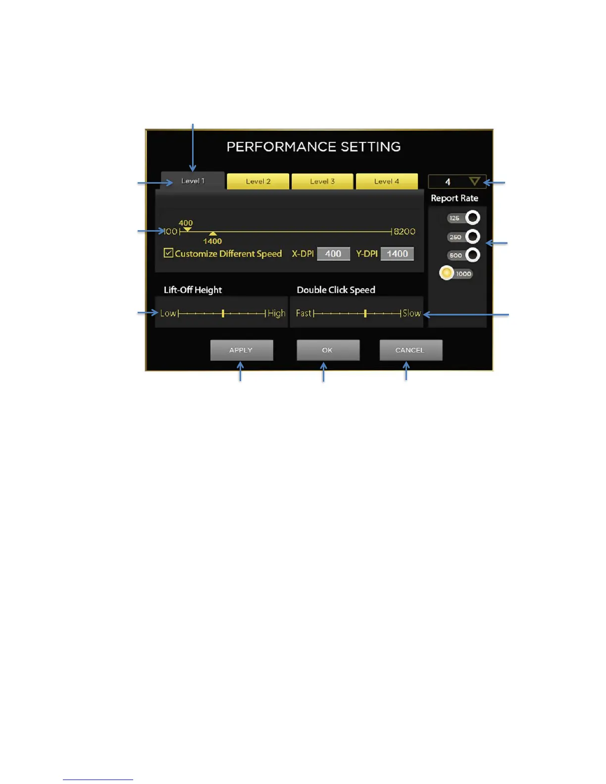 • Report (Polling) Rate can be set in the following levels – 125, 250, 500, or 1000 Hertz. Generally if you have a fast