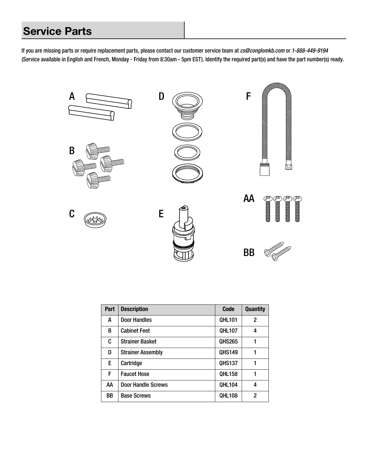 If you are missing parts or require replacement parts, please contact our customer service team at cs@conglomkb.com or 1-888-449-9194