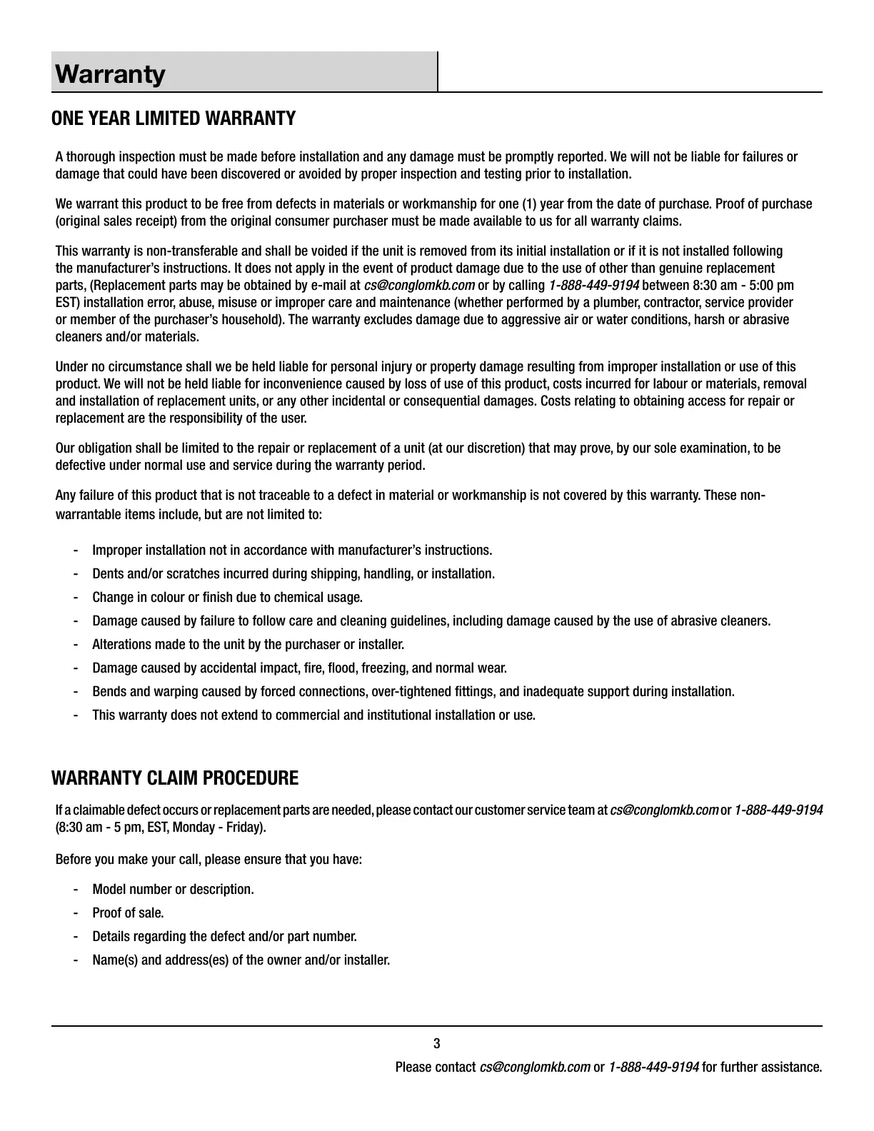 If a claimable defect occurs or replacement parts are needed, please contact our customer service team at cs@conglomkb.com or 1-888-449-9194