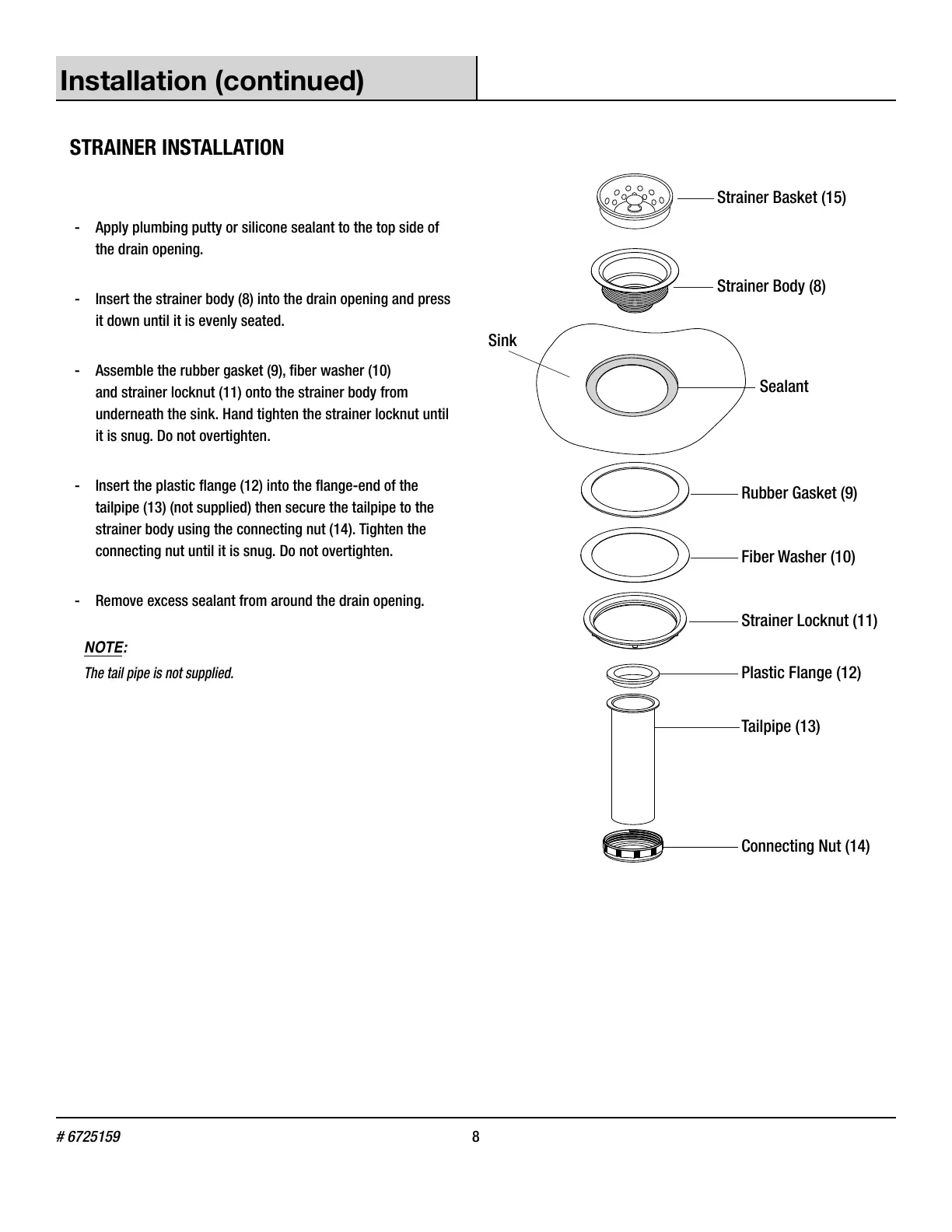 - Insert the strainer body (8) into the drain opening and press