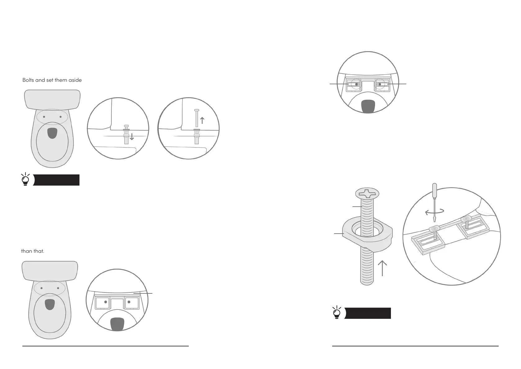 holes until they are nearly flush with the toilet rim. Keep the bolts in