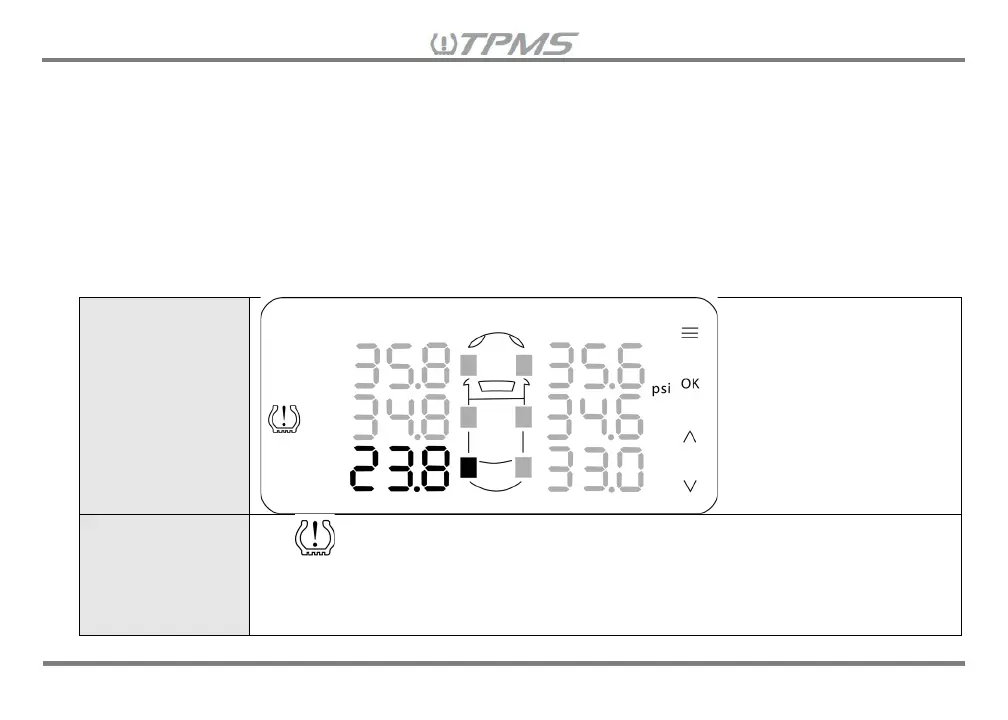 When these alarm parameters are met, the following alarm indicators will alert the user of a tire pressure