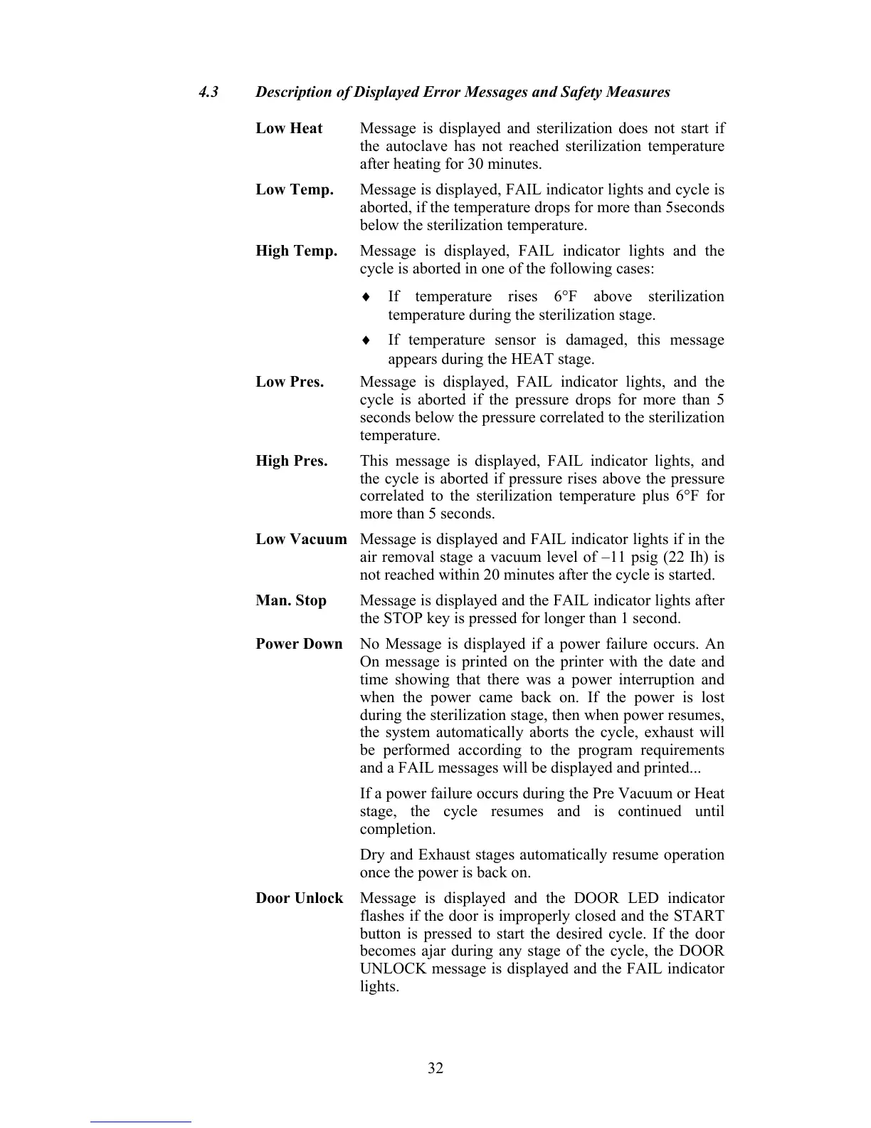 Tuttnauer 2540 EHS - Description of Displayed Error Messages and Safety Measures