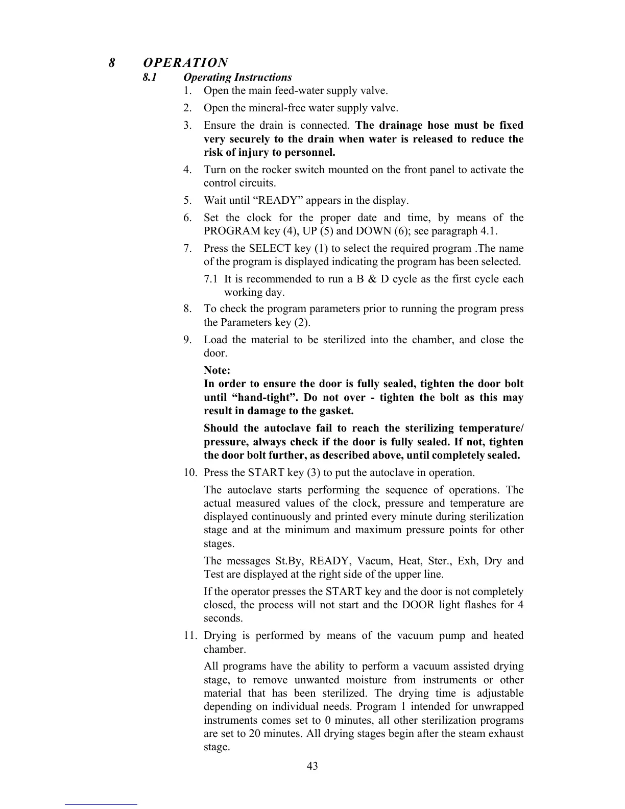 Tuttnauer 2540 EHS - 8 Operation; Operating Instructions