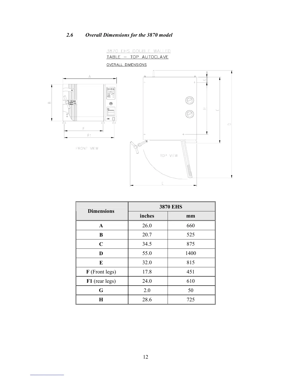 Tuttnauer 3870 EHS - Overall Dimensions for the 3870 Model