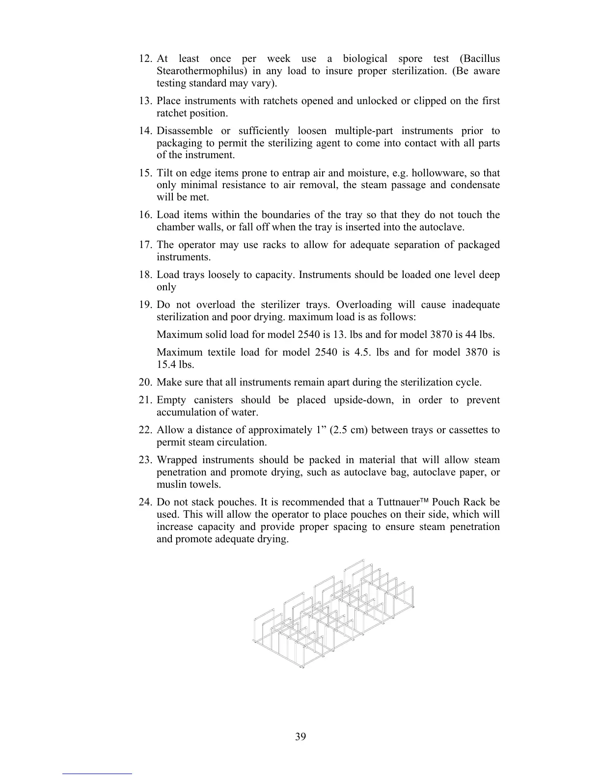 24. Do not stack pouches. It is recommended that a Tuttnauer Pouch Rack be