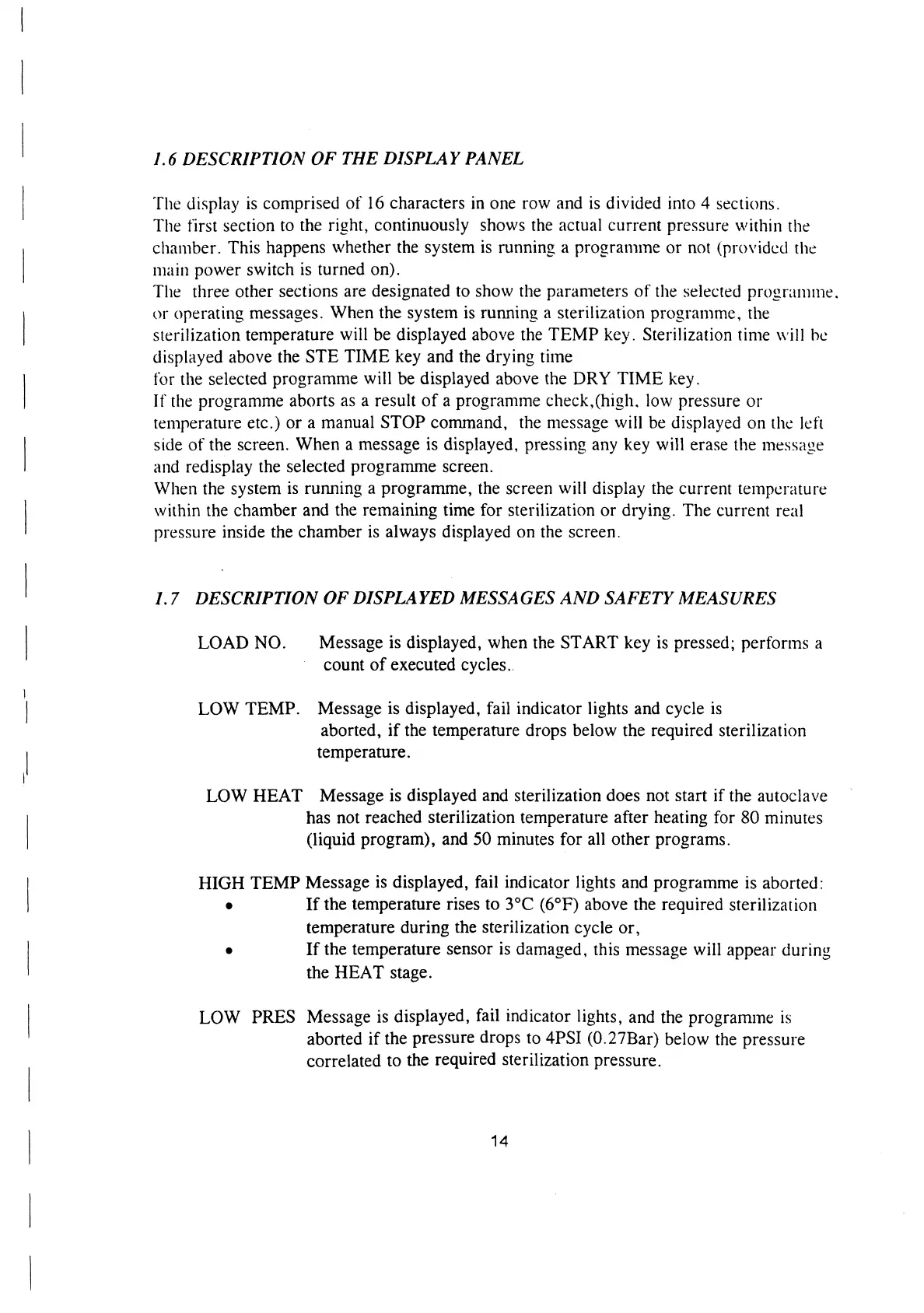 Tuttnauer EA - Description of the Display Panel; Display Messages and Safety Measures Description