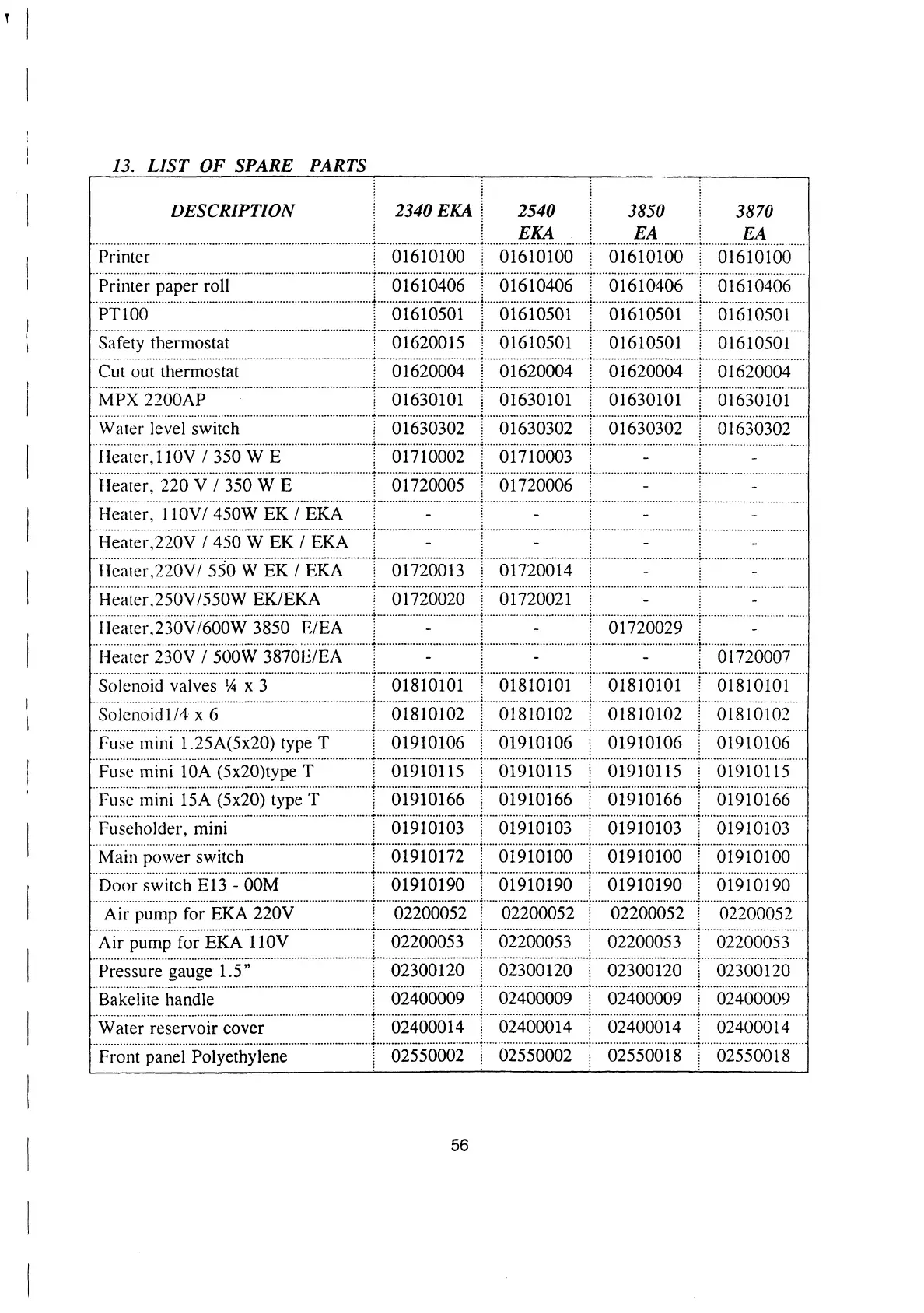 Tuttnauer EA - List of Spare Parts