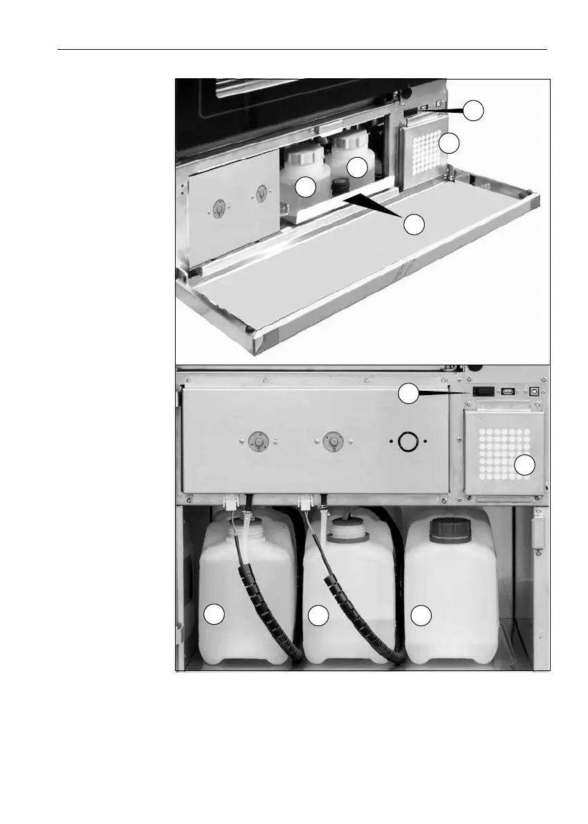 - 1) DOS1 detergent liquid container. - 2) DOS2 rinsing liquid