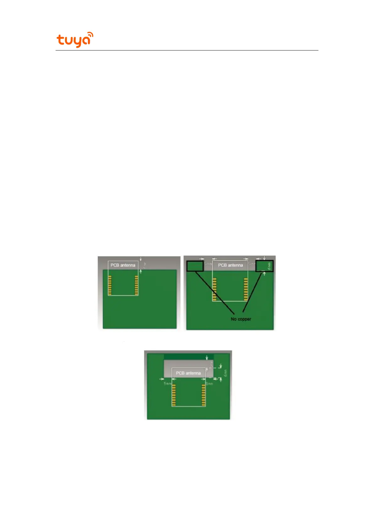 To prevent adverse impact on the antenna radiation performance, avoid copper or traces