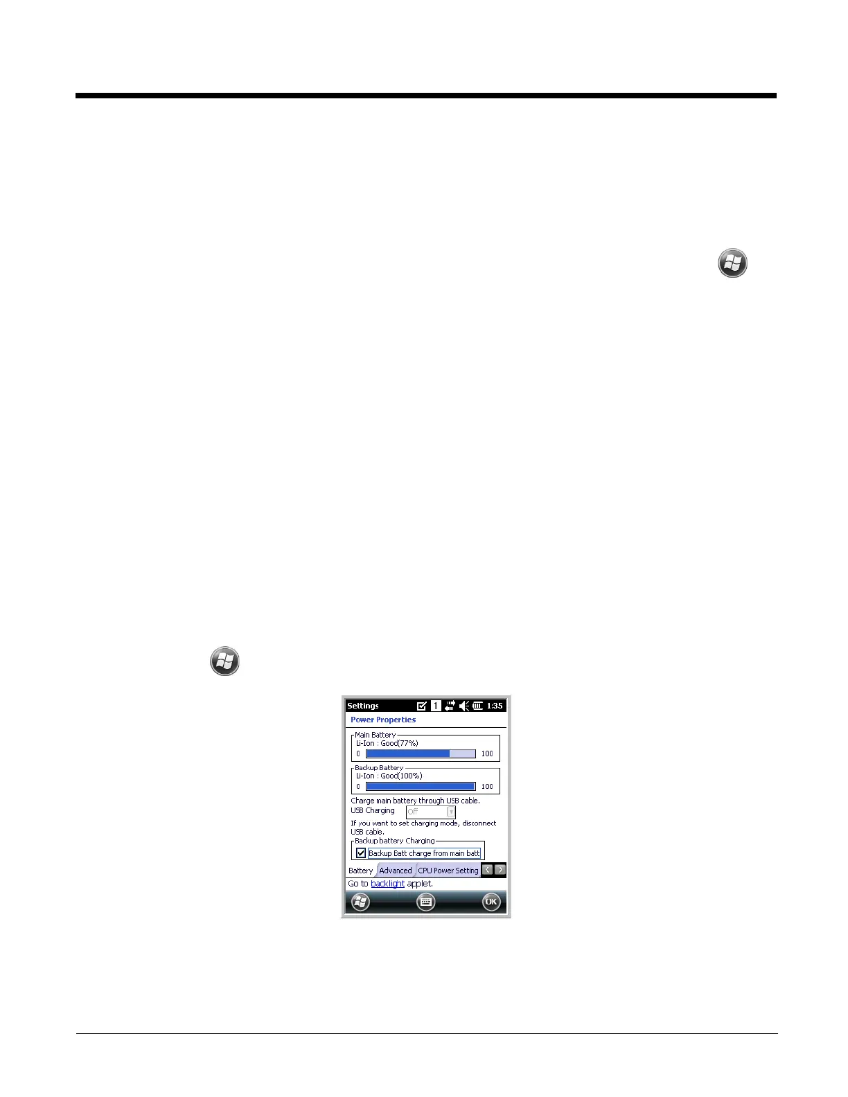 Power icons appear in the title bar at the top of the window. Tap on the battery icon to open the Power
