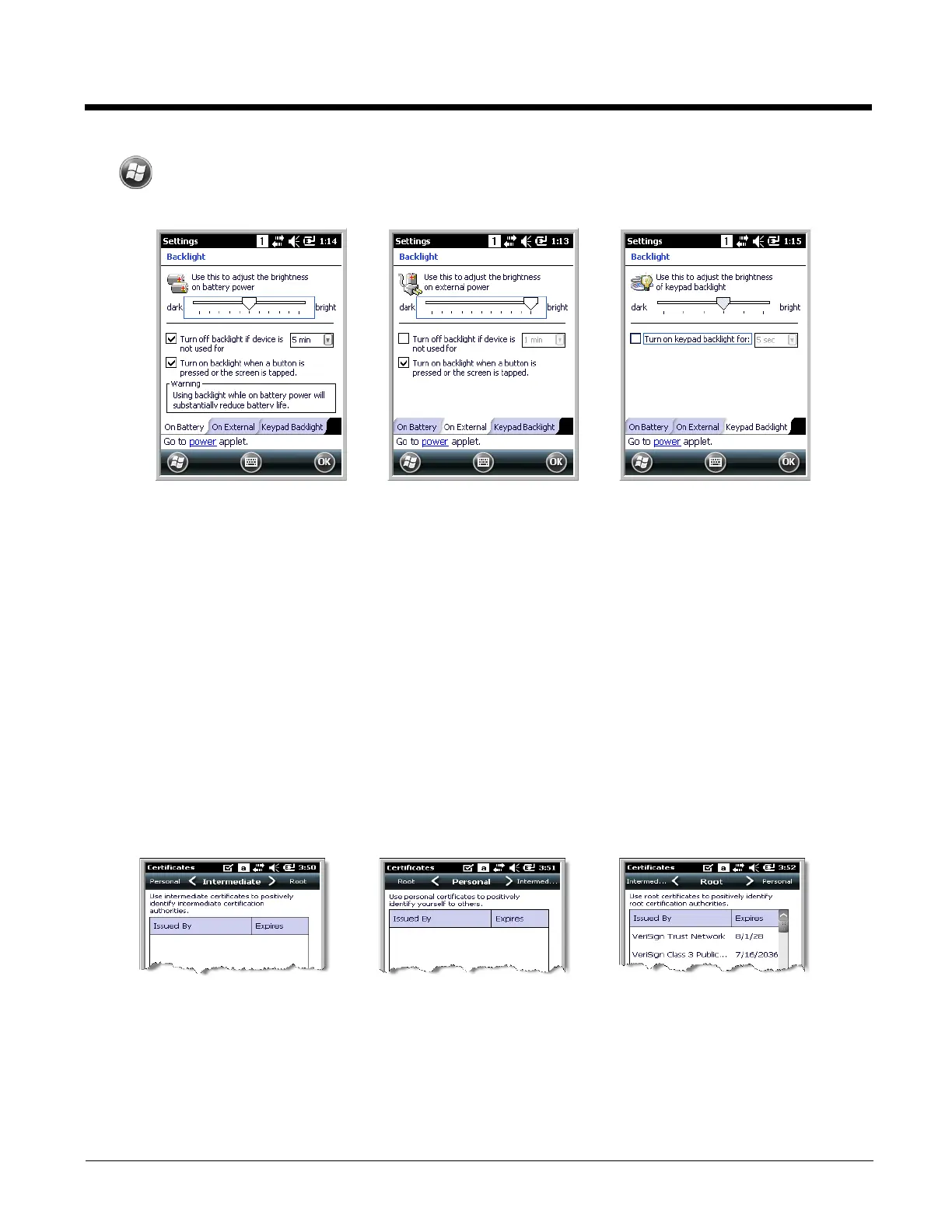 The On External tab determines the backlight timeout when the terminal is running on external power.