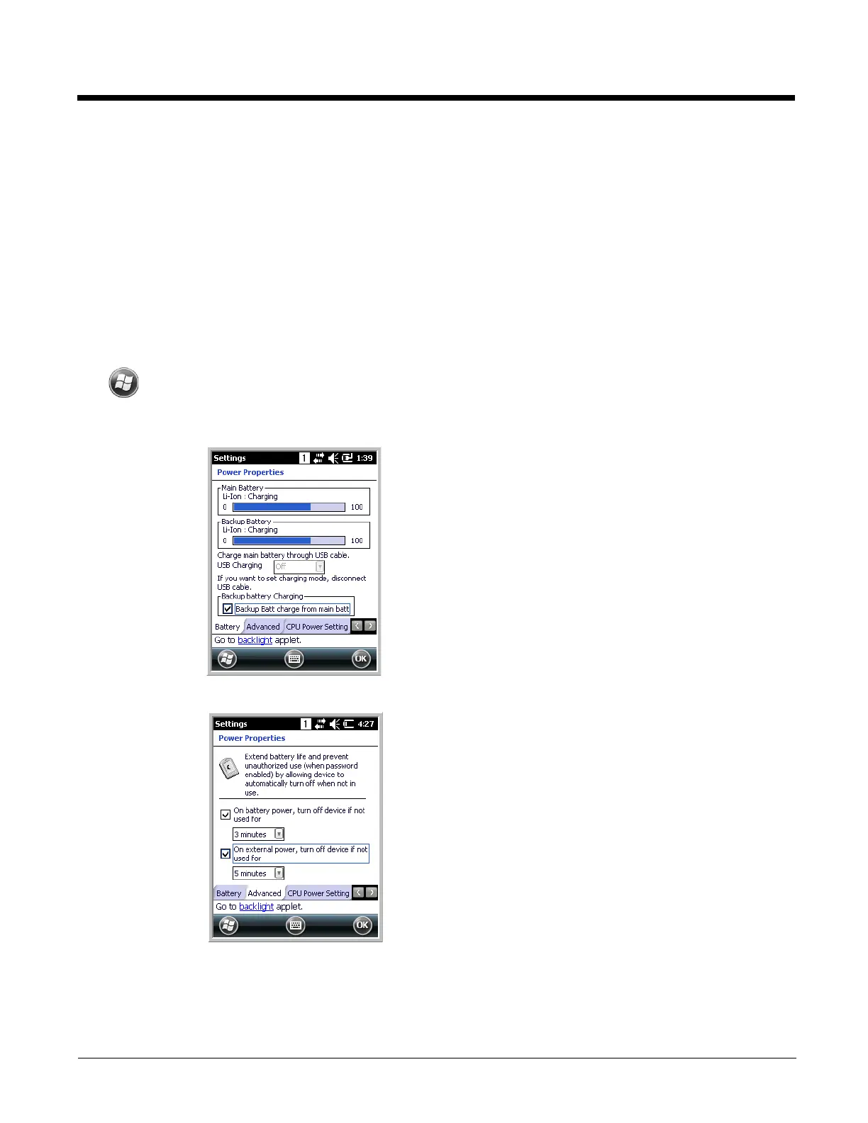 main battery and the status of the backup battery.