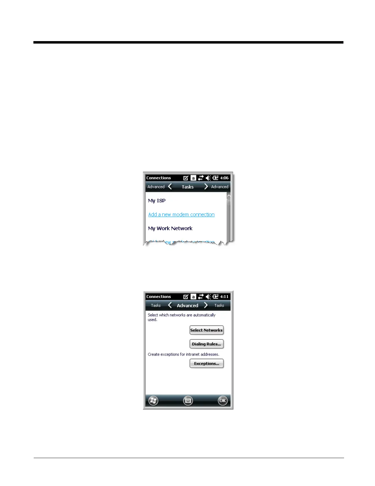 The Advanced screen enables you to select the default network, dialing rules, and IP address exceptions