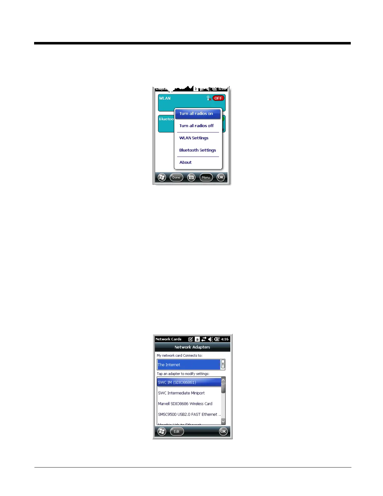 Each radio has its own configuration utility that you can access by tapping Menu on the tile bar.