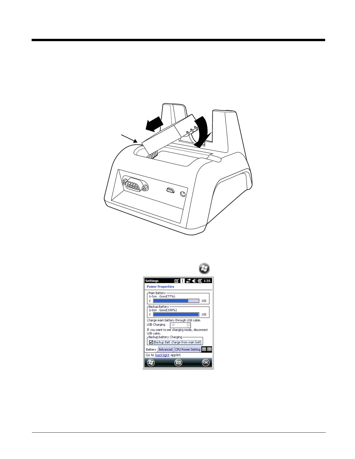 battery can be inserted in the battery charging well in back of the terminal connection. Place the battery