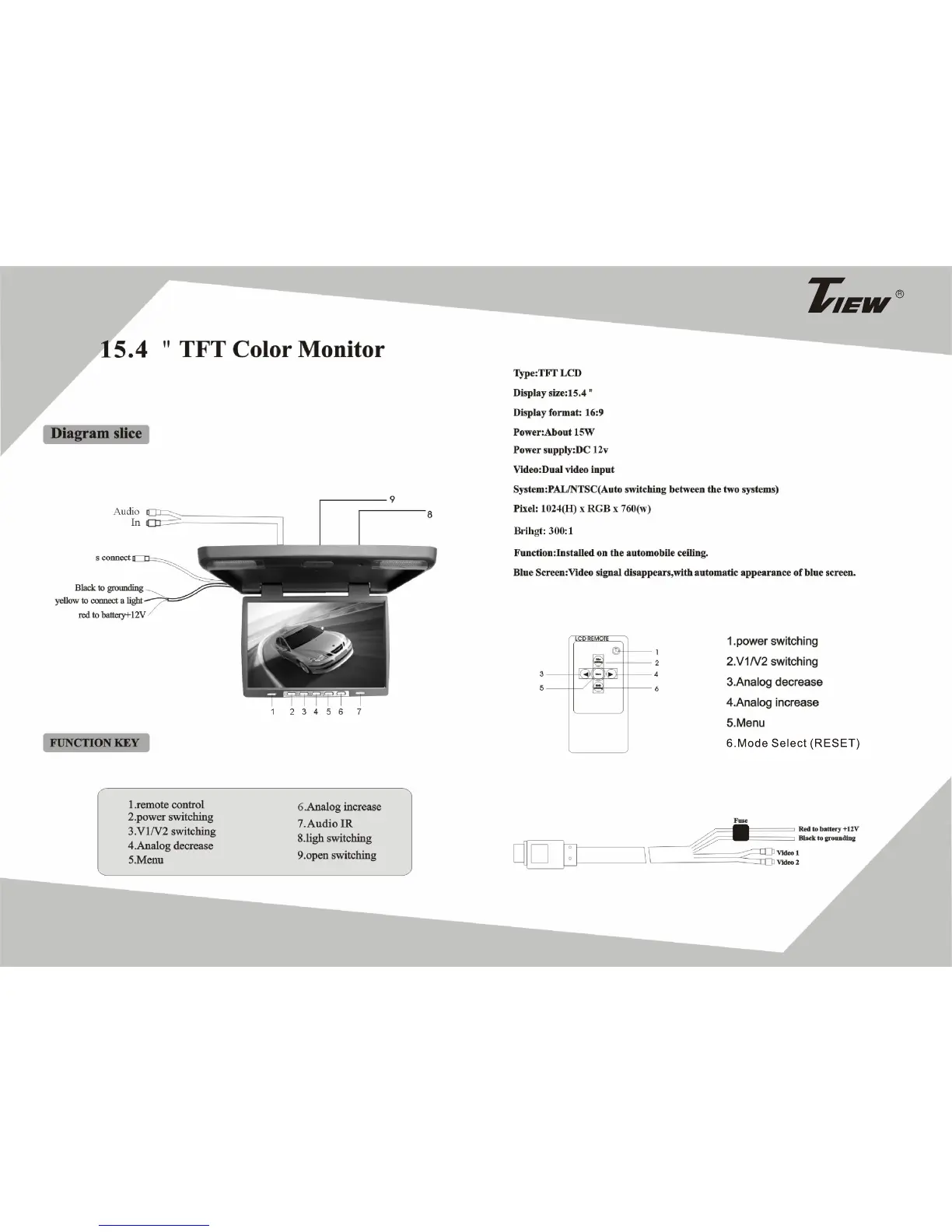Tview T156IR - Product Specifications Overview; Monitor Diagram and Function Keys; LCD Remote Control Functions